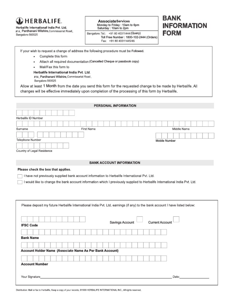 Herbalife Bank Information Form India